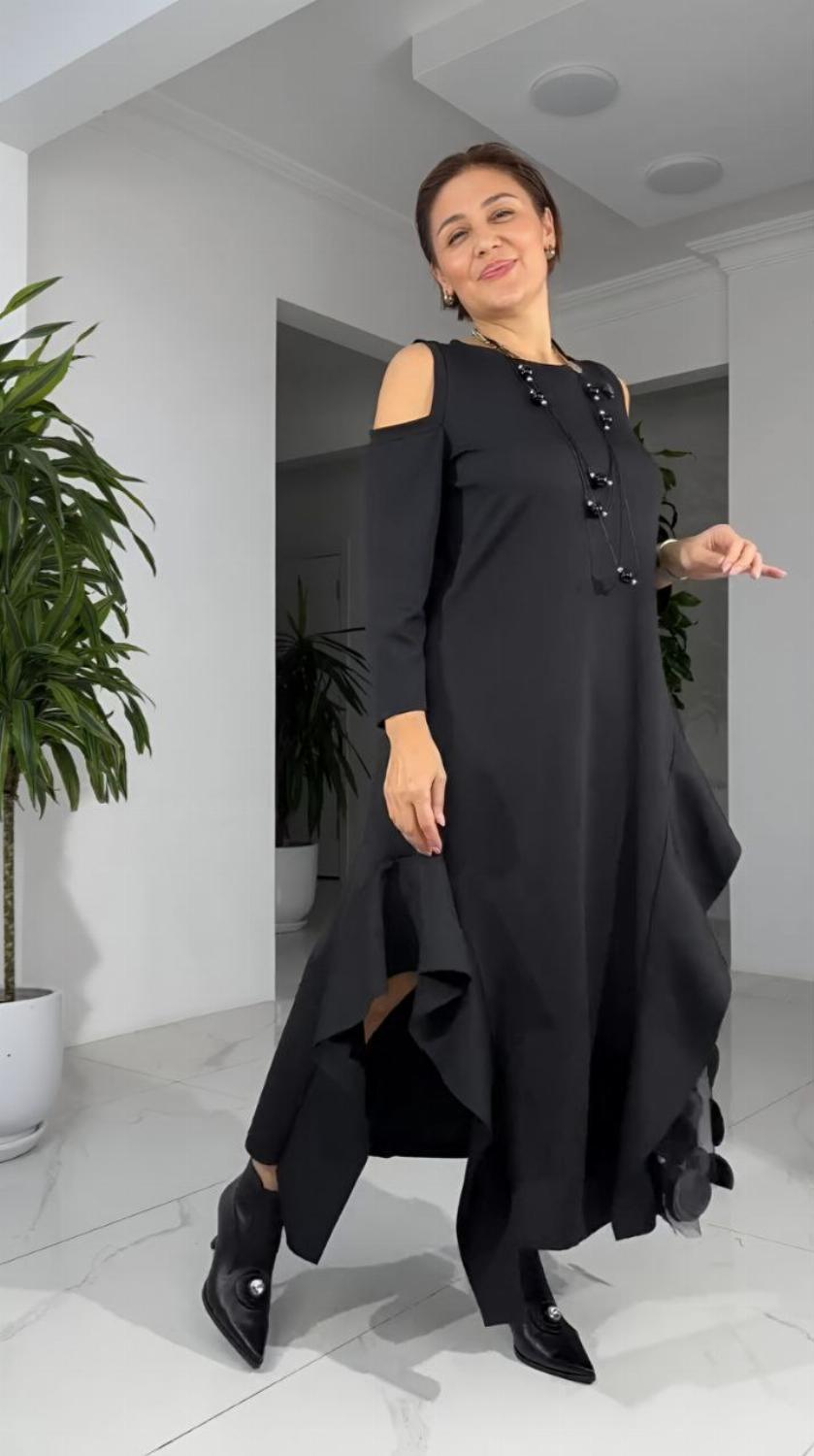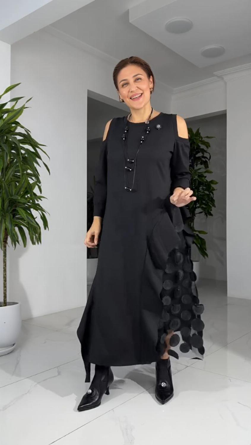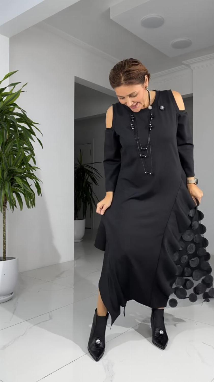 Легка асиметрія, елегантні вирізи на плечах і гра текстур створюють образ, що вражає своєю сучасністю та жіночністю.