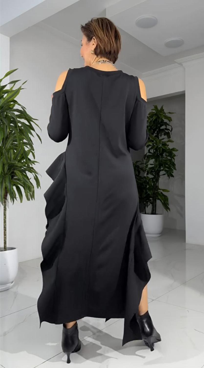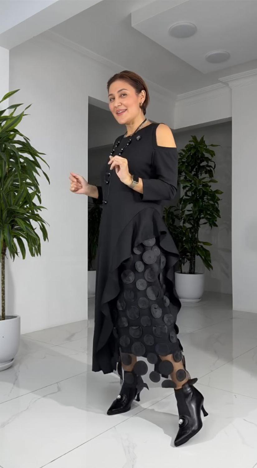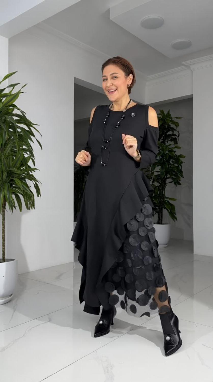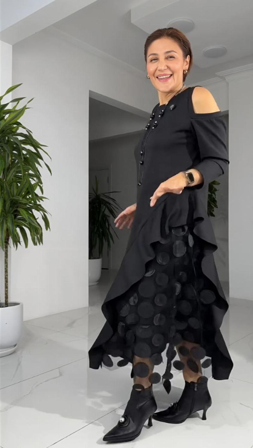 Легка асиметрія, елегантні вирізи на плечах і гра текстур створюють образ, що вражає своєю сучасністю та жіночністю.