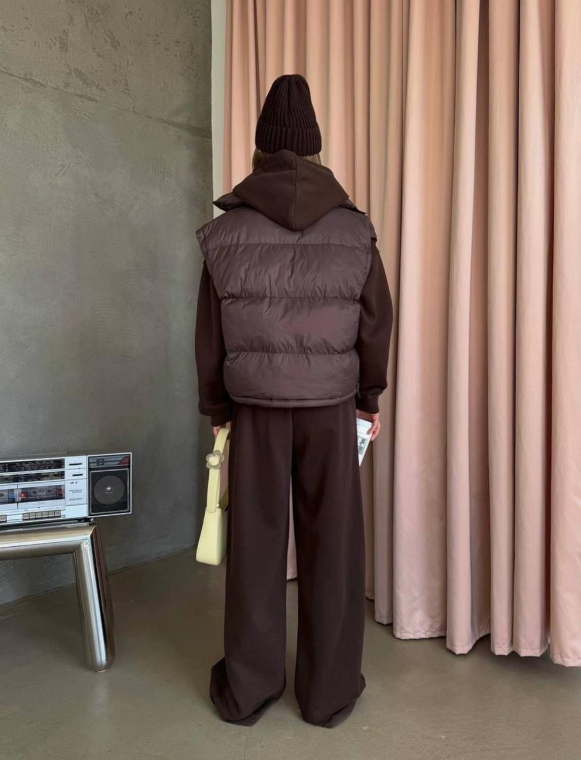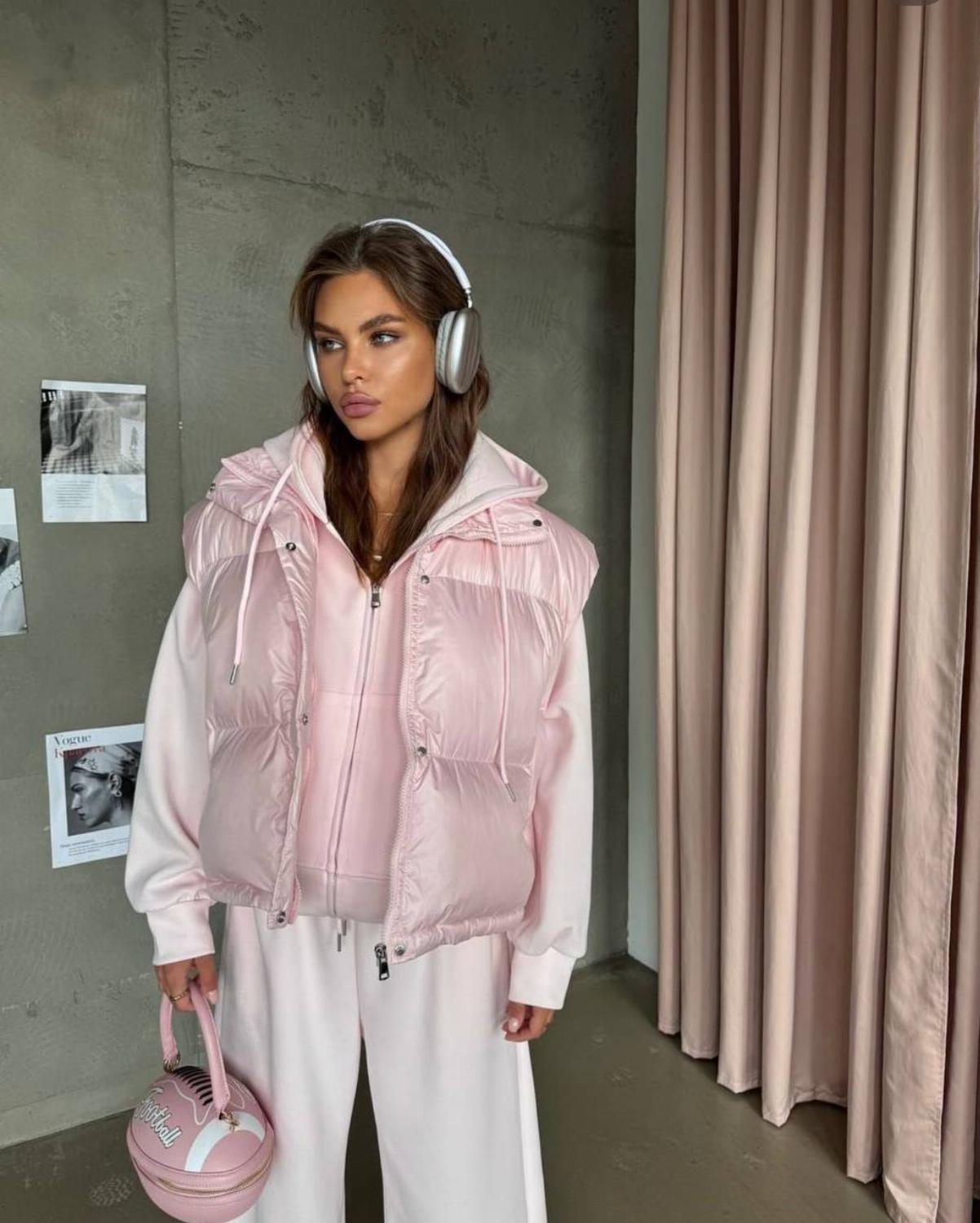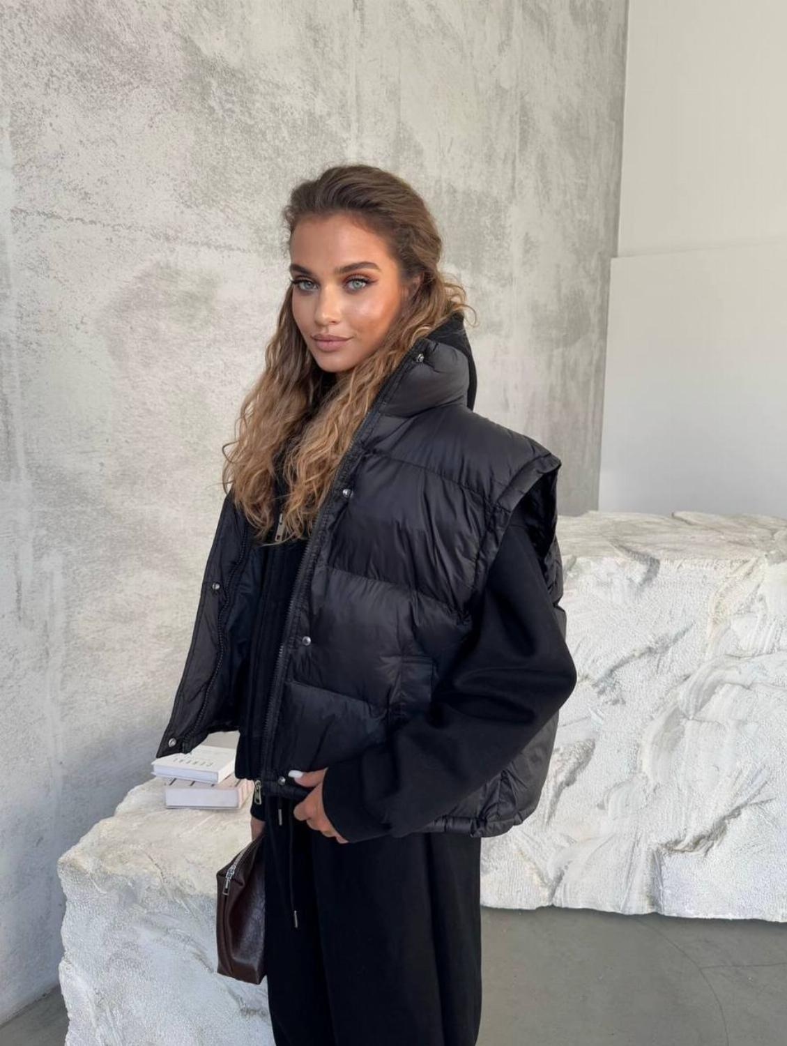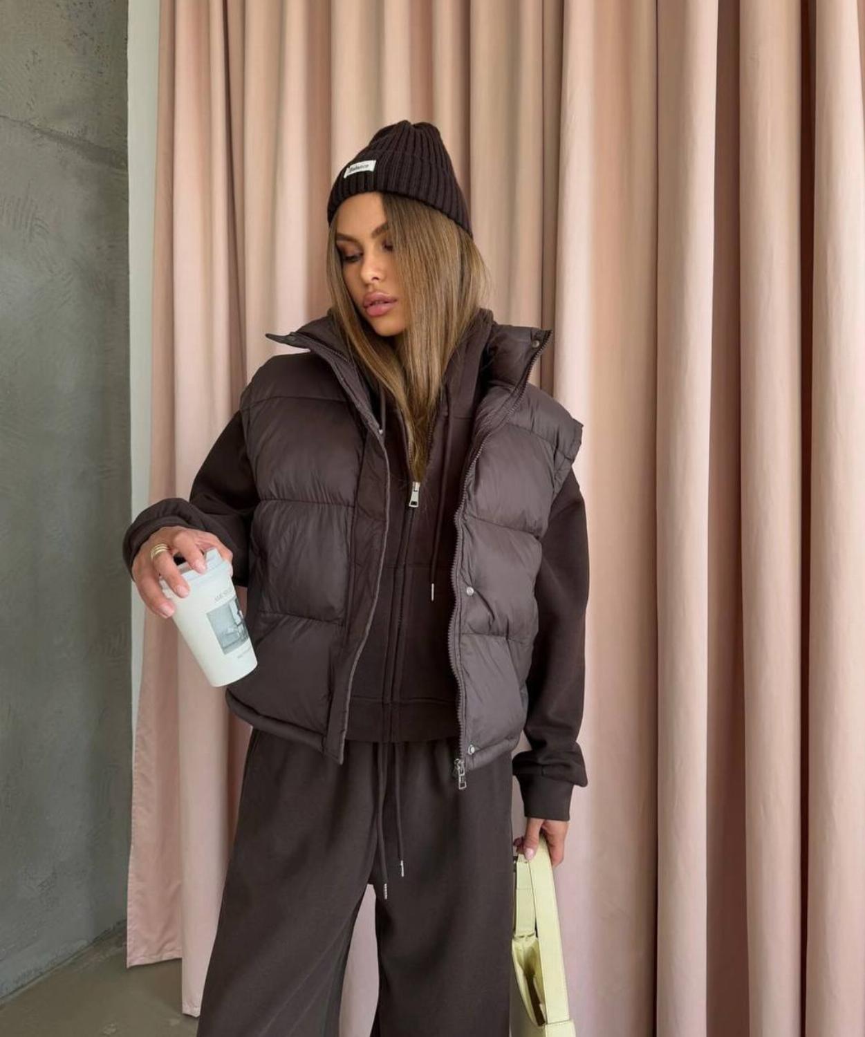 Жилетка: виконана з плащівки лаке, наповнена еко-пухом 200 – легка, але тепла, захищає від вітру та створює стильний акцент в образі.