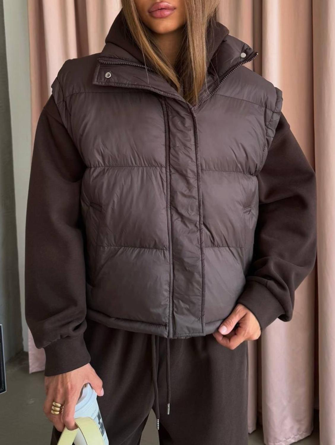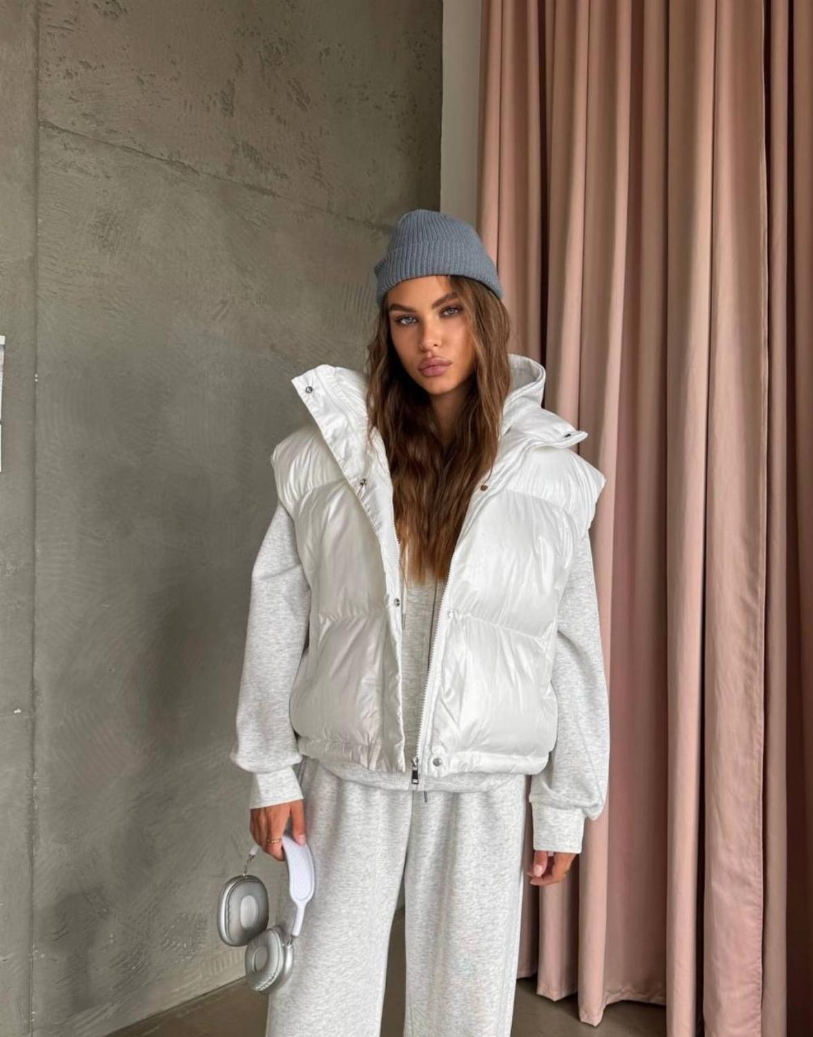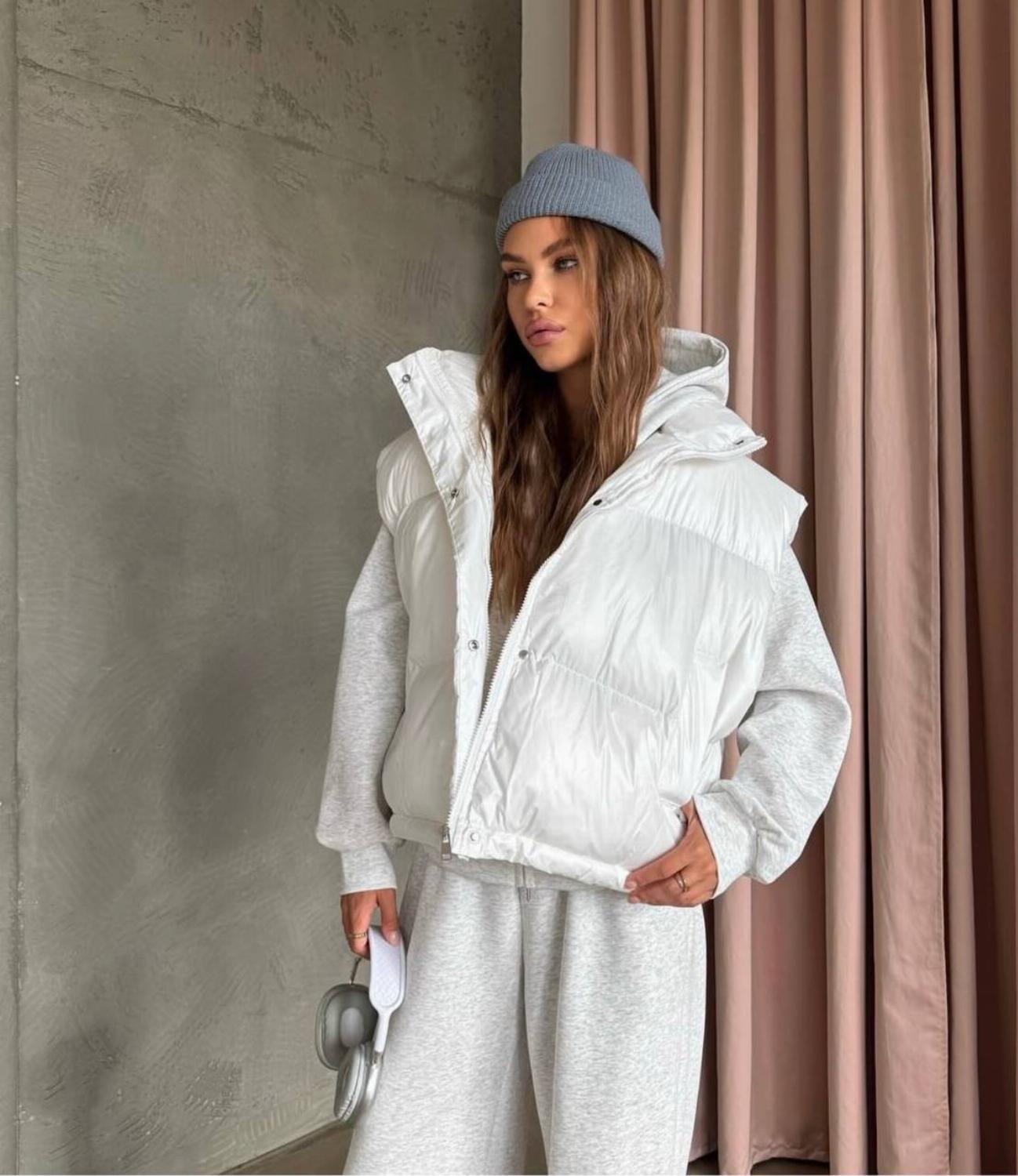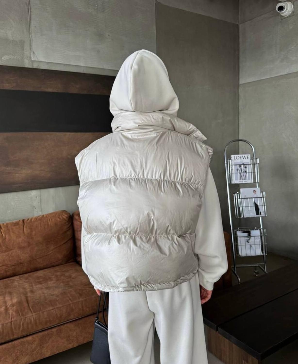 Жилетка: виконана з плащівки лаке, наповнена еко-пухом 200 – легка, але тепла, захищає від вітру та створює стильний акцент в образі.