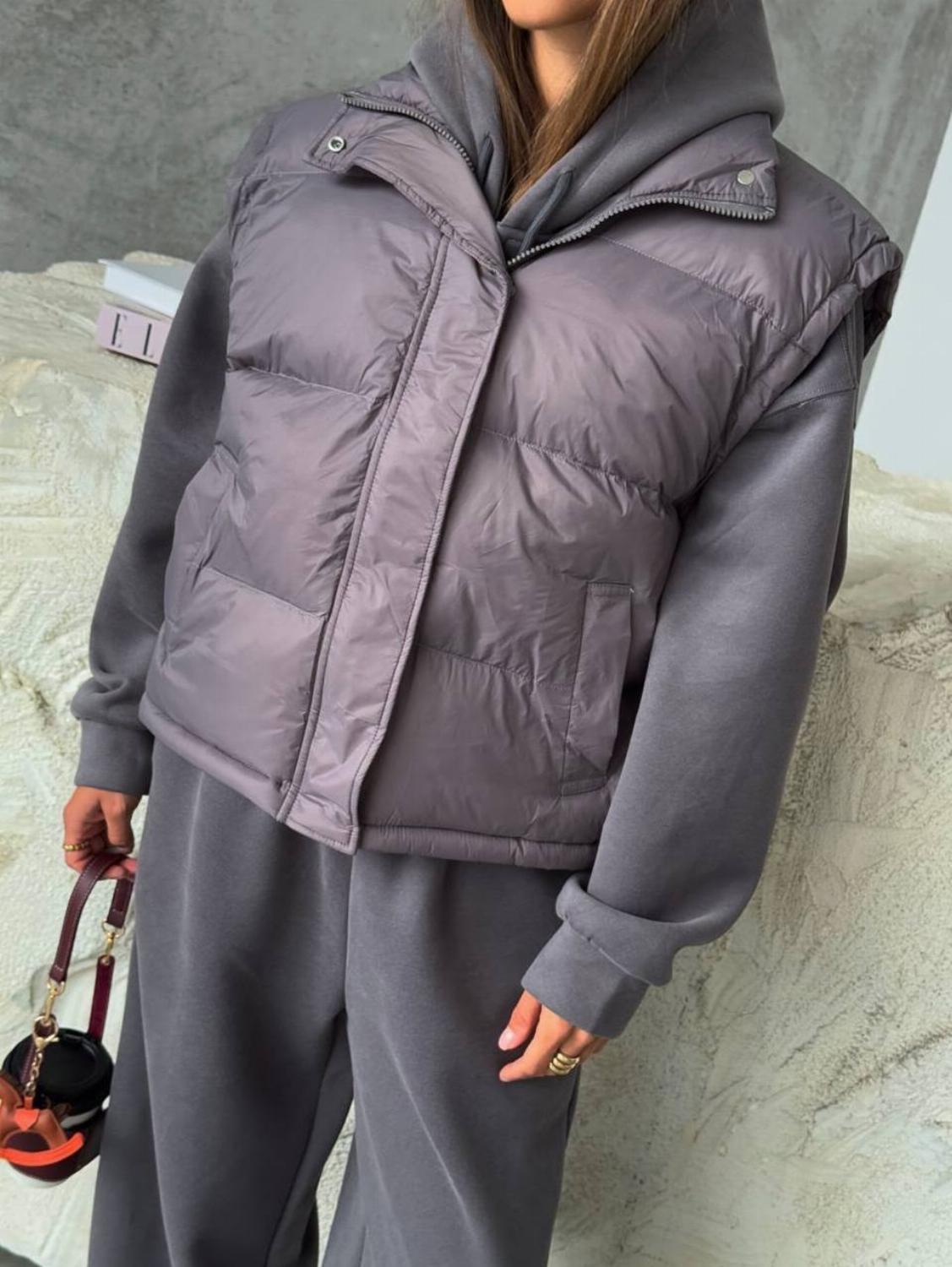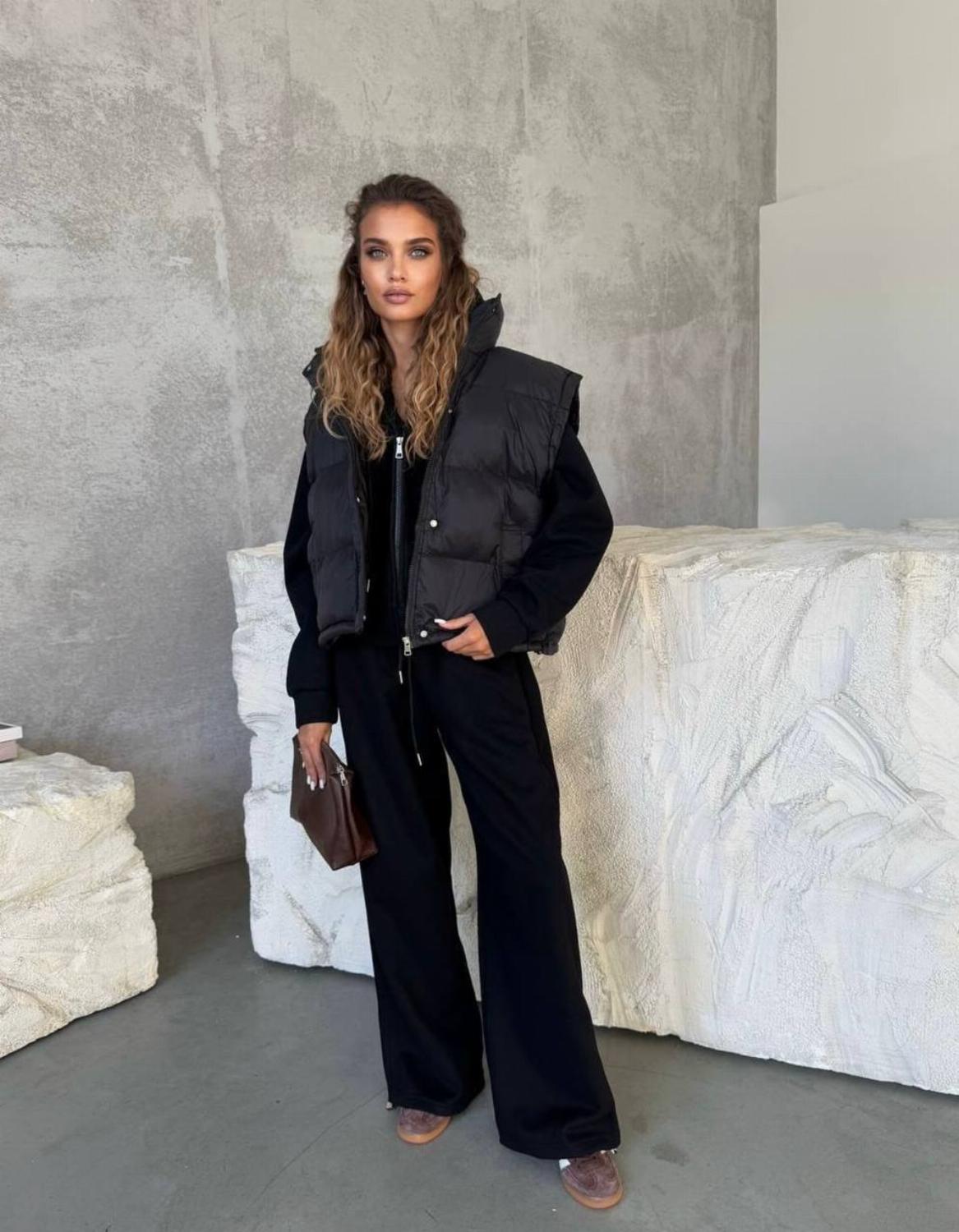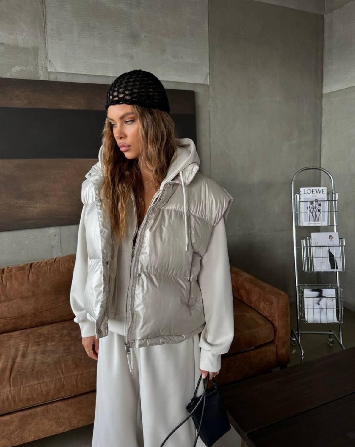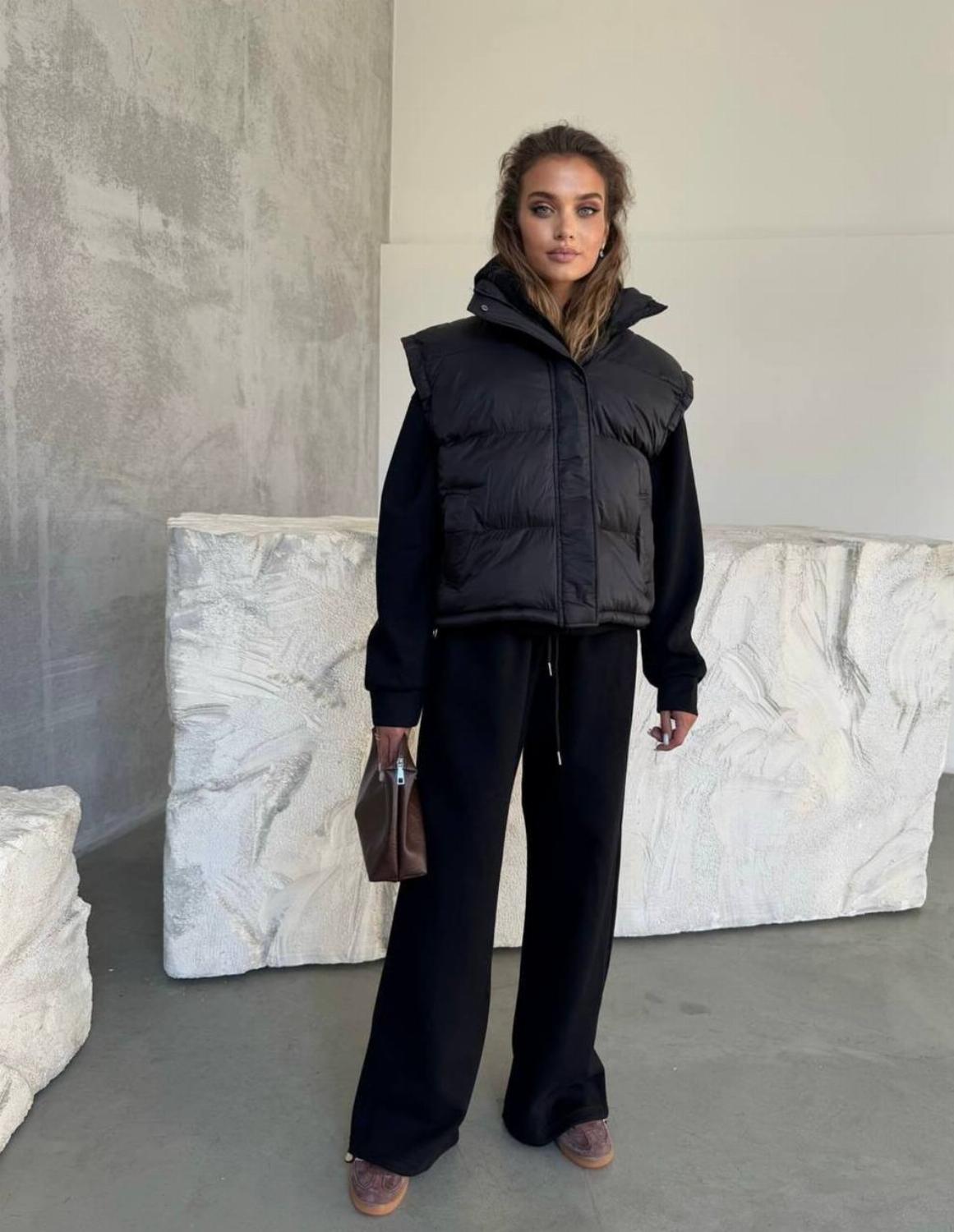 Жилетка: виконана з плащівки лаке, наповнена еко-пухом 200 – легка, але тепла, захищає від вітру та створює стильний акцент в образі.