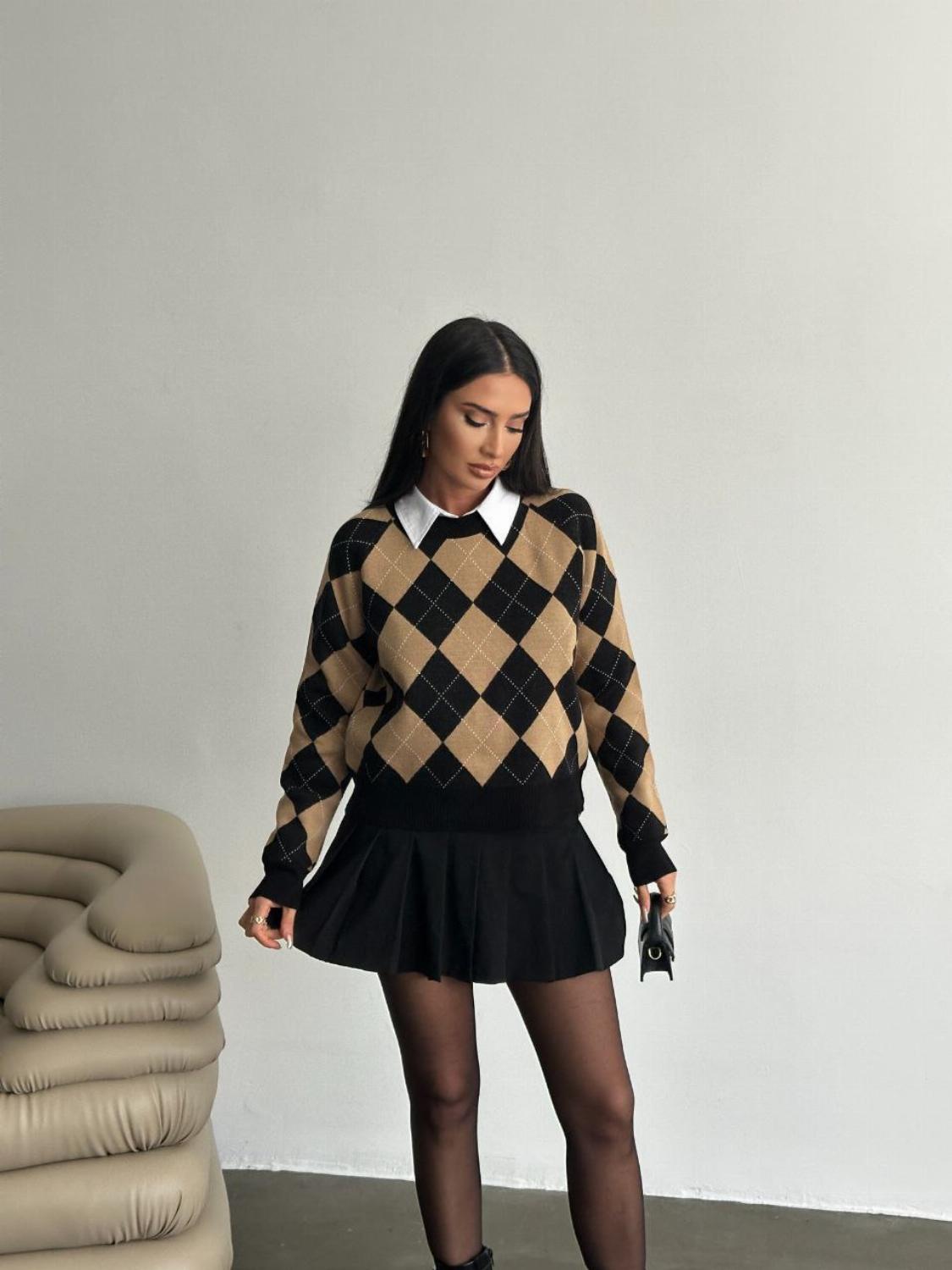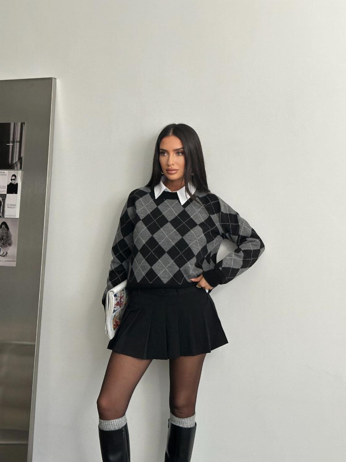 Класичний ромбовий візерунок у відтінках сірого та чорного поєднується з білим комірцем, додаючи образу елегантності та впевненості.