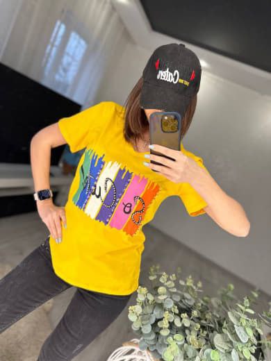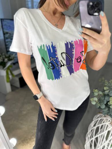 Красива літня футболка з вишивкою на грудях; спереду прикрашена яскравим принтом та стразами. Має короткий рукав та вільний фасон. Футболка добре поєднується з джинсовими шортиками та капрі. Для пошиття використано лише якісний турецький матеріал – у ньому не жарко влітку, тіло добре дихає. Тканина не вигоряє на сонці, зберігає свій колір і форму. Річ якісна та легка, відрізняється красивим дизайном та універсальним кроєм. Гарний повсякденний одяг, який можна одягнути і на прогулянку, і на роботу.