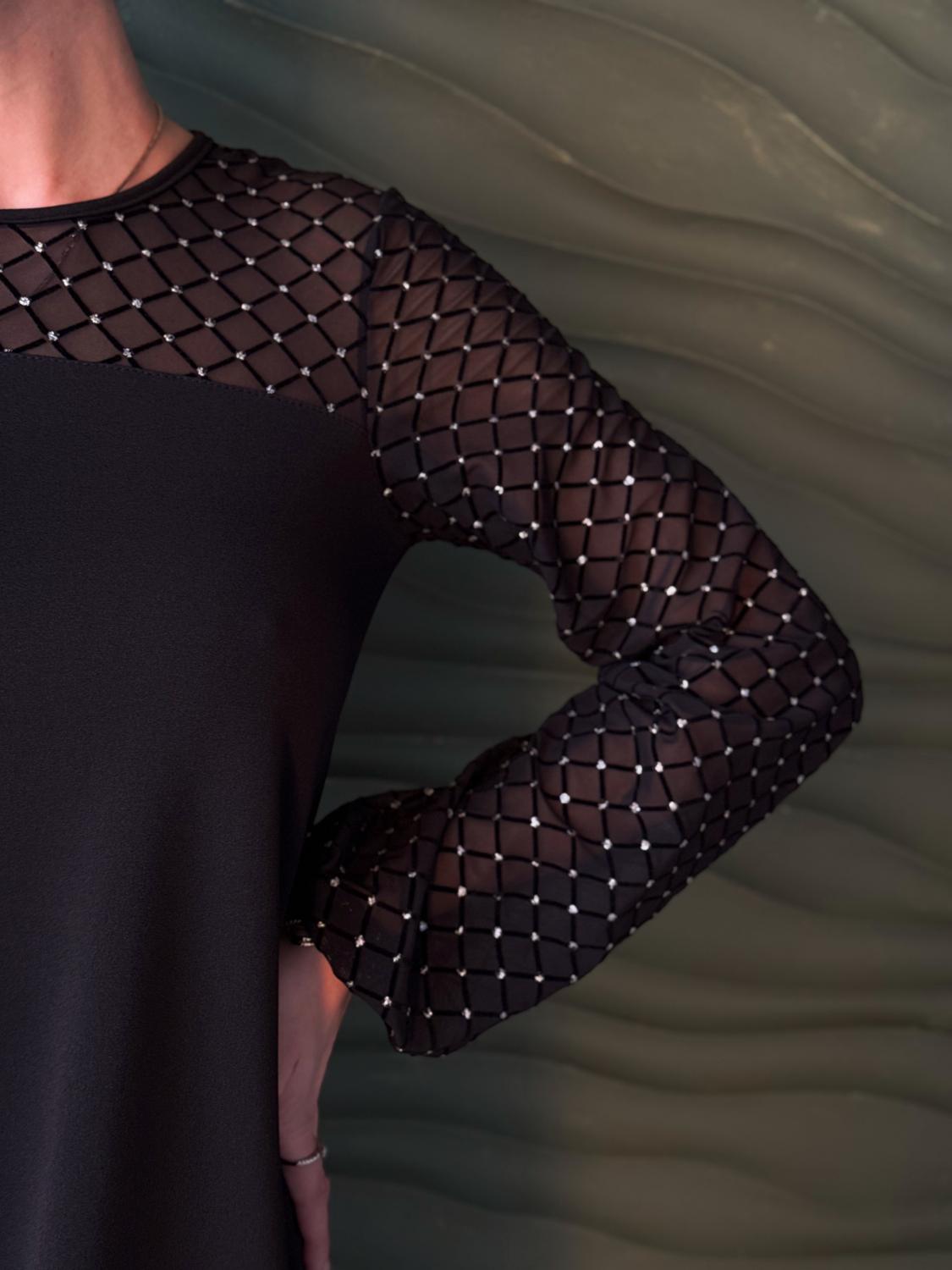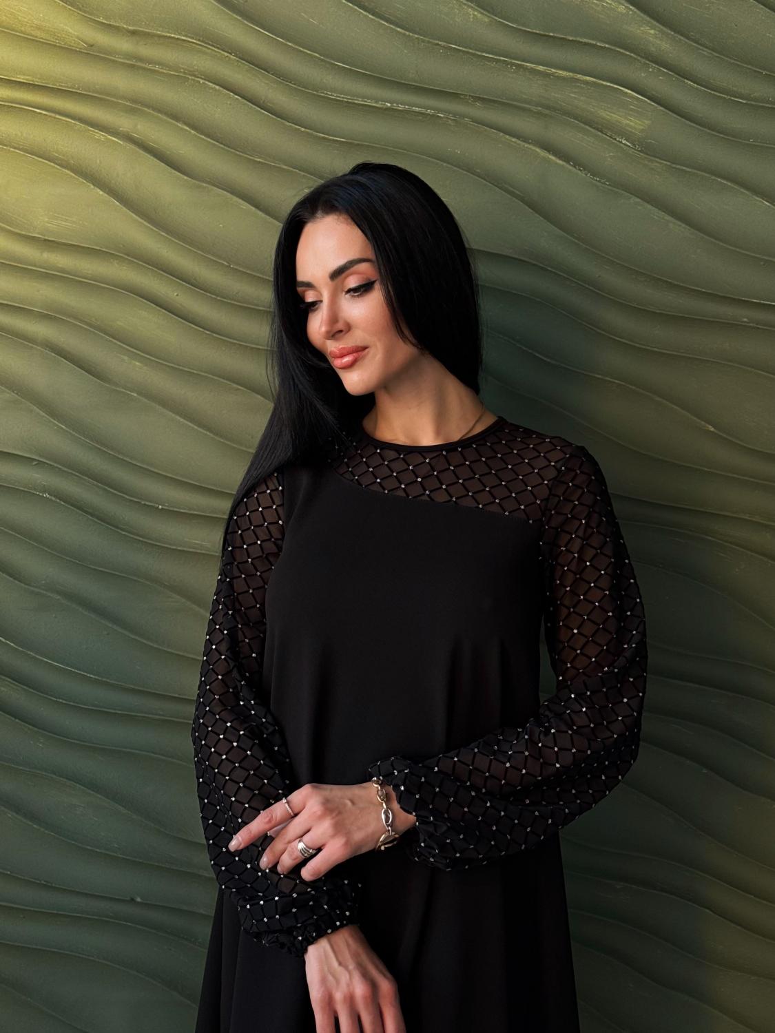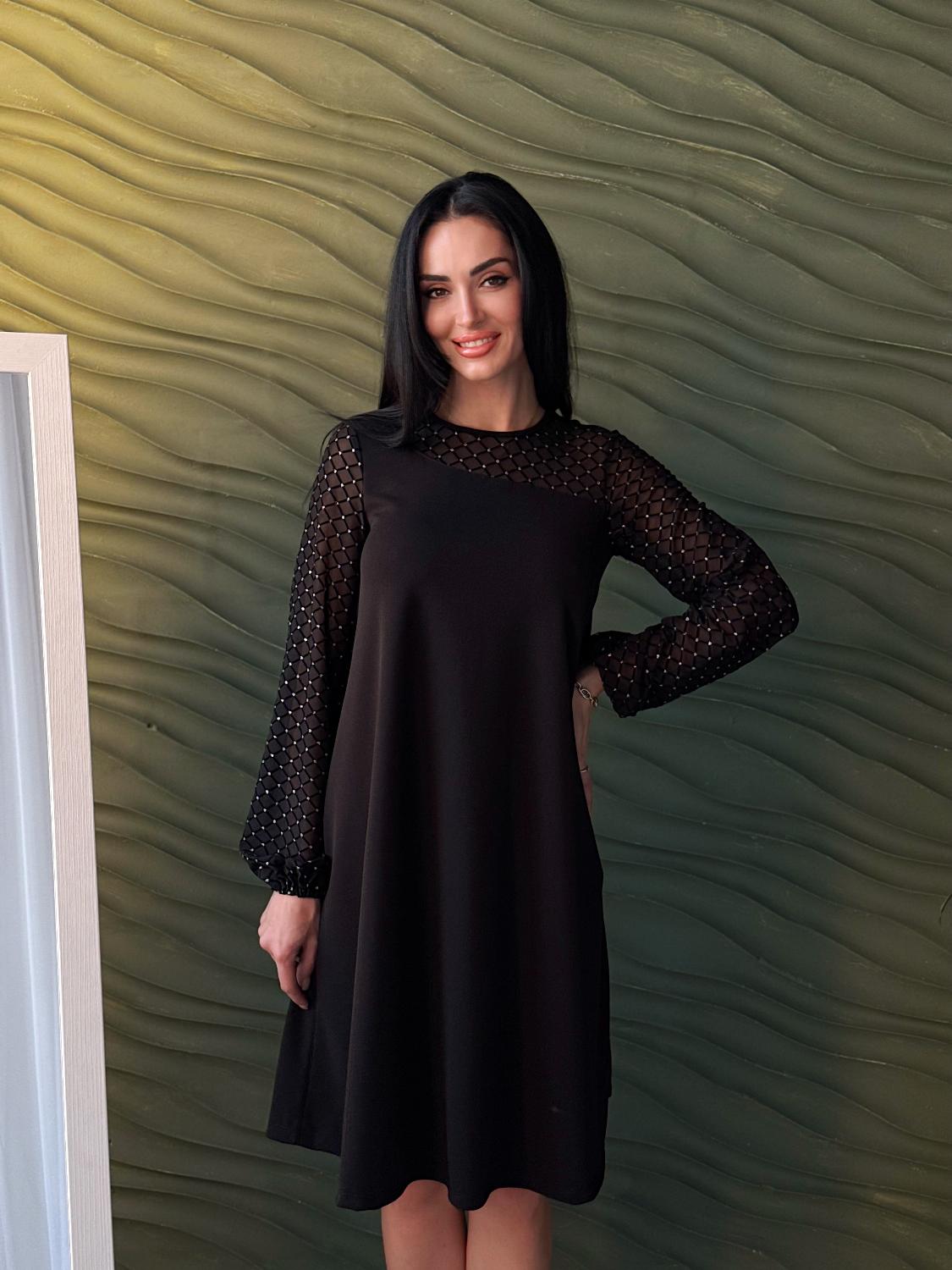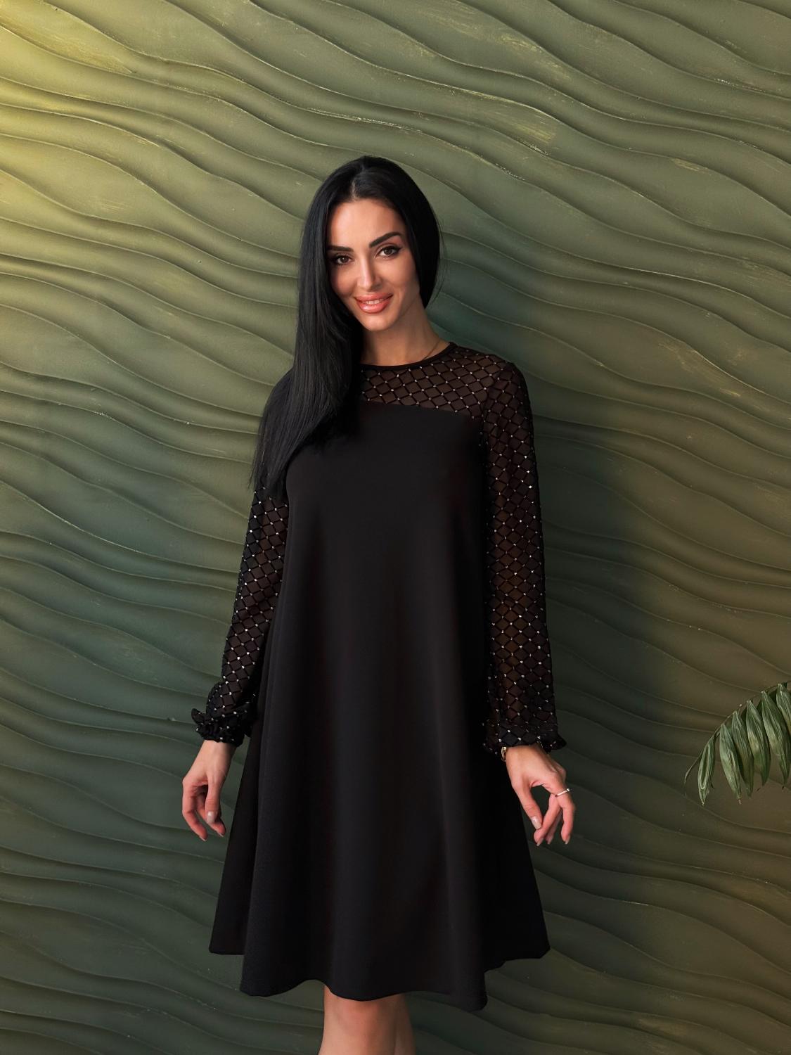 Вечірня сукня з прозорими рукавами — це елегантний вибір для святкових подій, корпоративів, ресторанних виходів чи походів до театру. Поєднання креп дайвінгу та прозорої сіточки з блискітками створює оригінальний контраст, завдяки якому модель виглядає вишукано та одразу привертає увагу. Класичні кольори підкреслюють універсальність і роблять сукню доречною для будь-якого «виходу в світ». Трапецієподібний вільний крій м’яко окреслює фігуру та гарантує комфорт, а довгі рукави з блискучої сіточки додають образу святковості й особливого шарму.