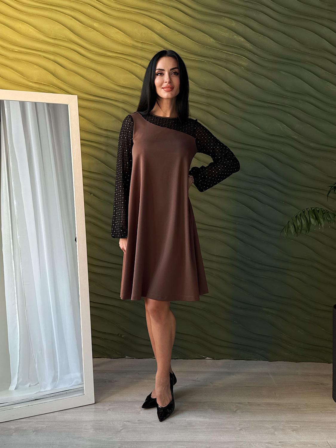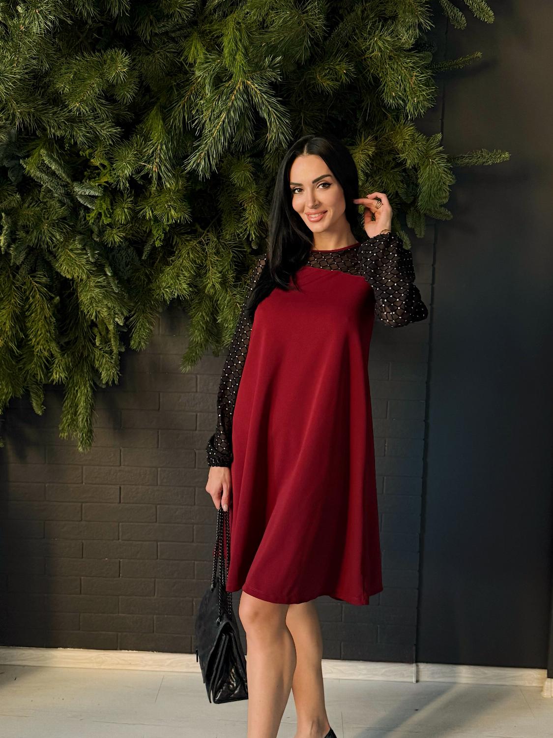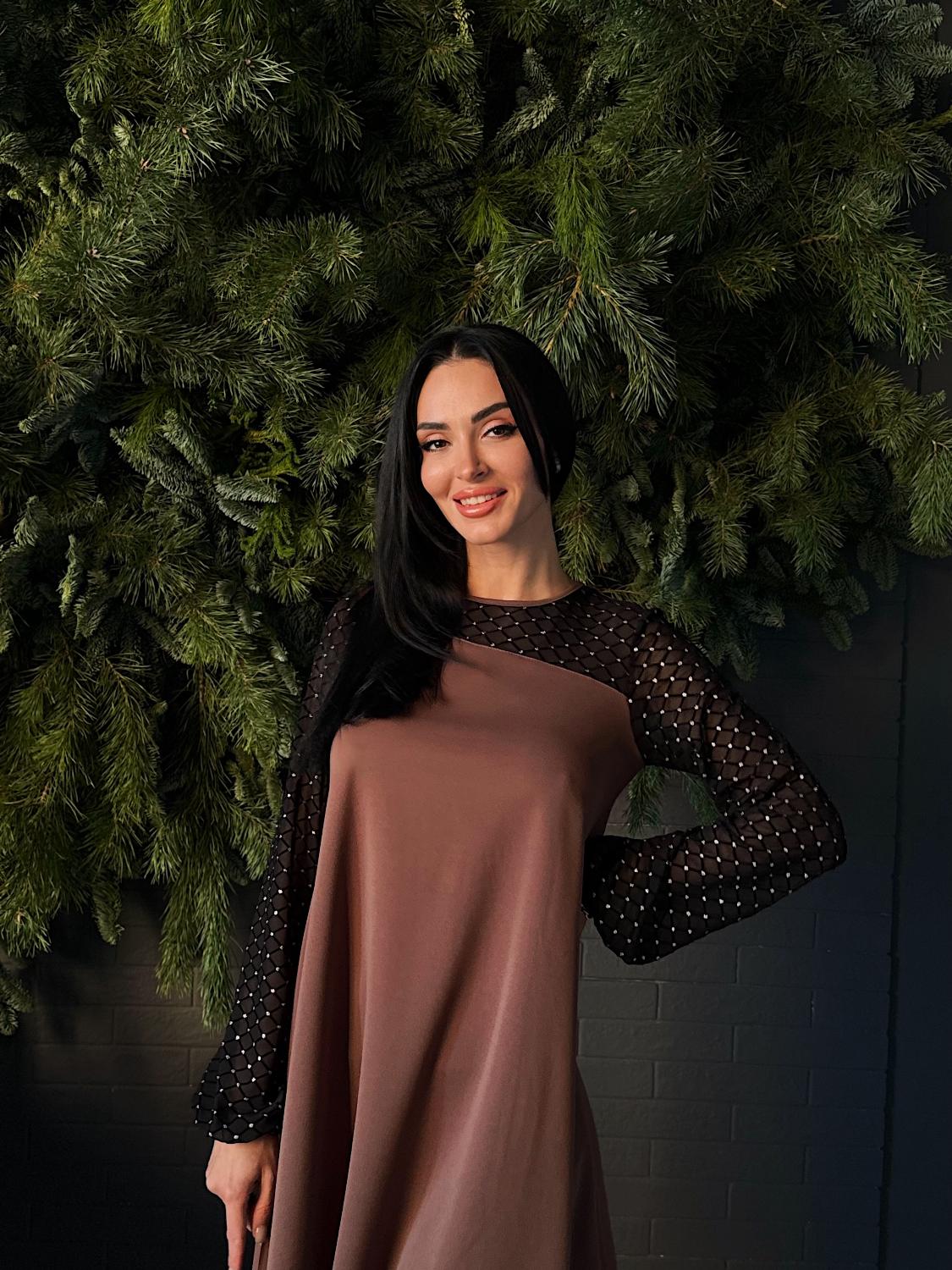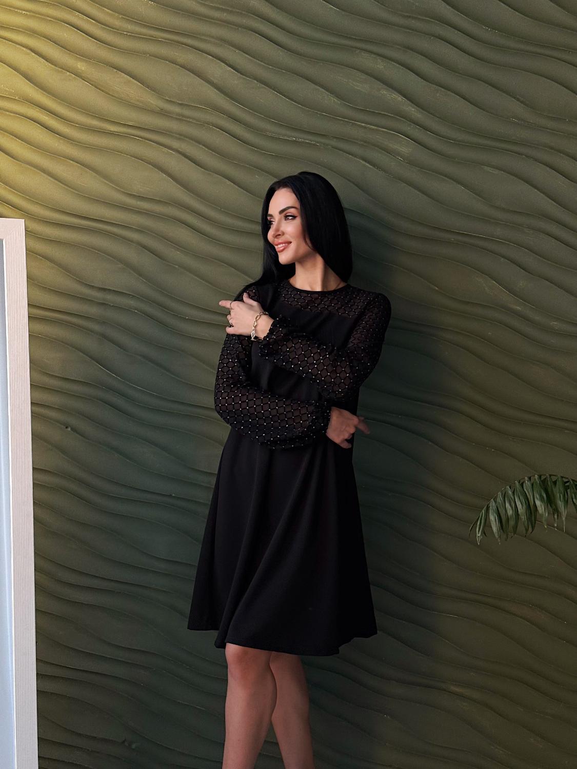 Вечірня сукня з прозорими рукавами — це елегантний вибір для святкових подій, корпоративів, ресторанних виходів чи походів до театру. Поєднання креп дайвінгу та прозорої сіточки з блискітками створює оригінальний контраст, завдяки якому модель виглядає вишукано та одразу привертає увагу. Класичні кольори підкреслюють універсальність і роблять сукню доречною для будь-якого «виходу в світ». Трапецієподібний вільний крій м’яко окреслює фігуру та гарантує комфорт, а довгі рукави з блискучої сіточки додають образу святковості й особливого шарму.
