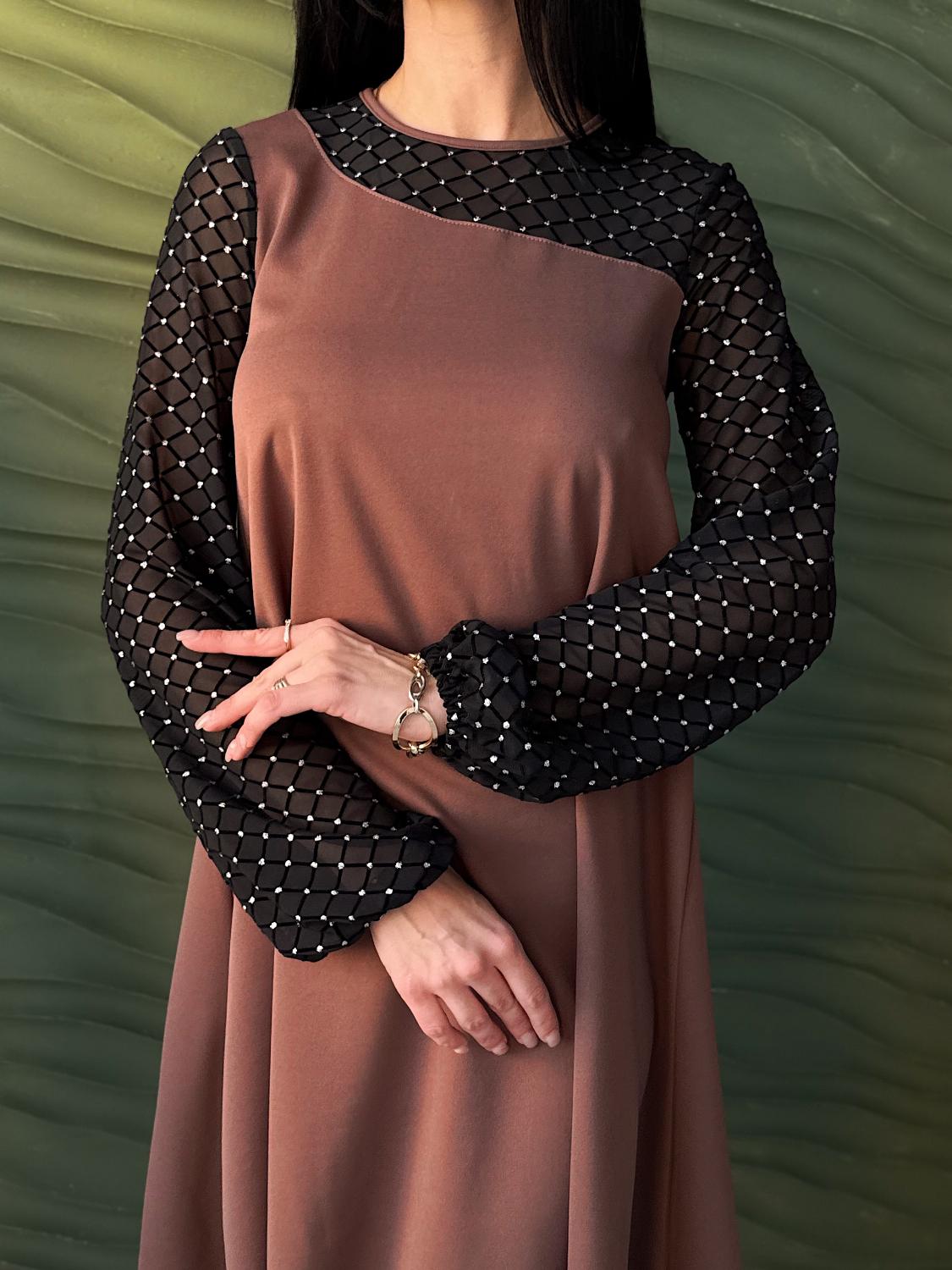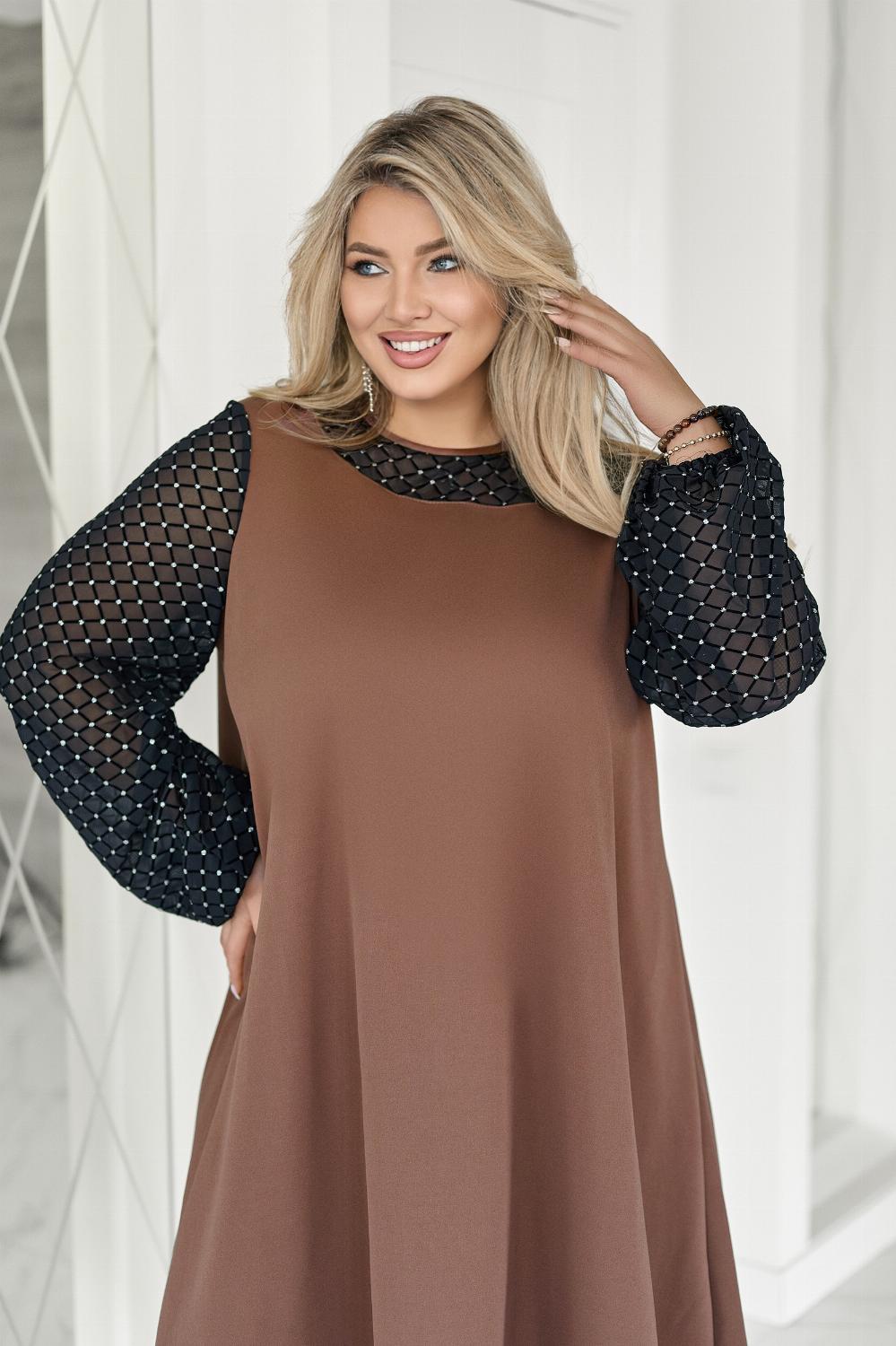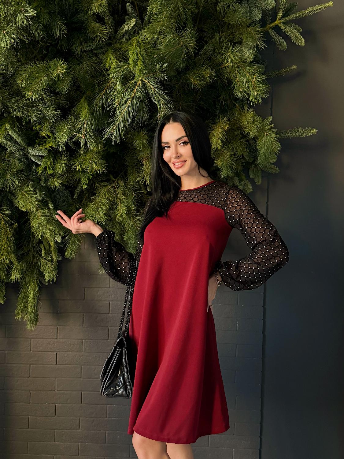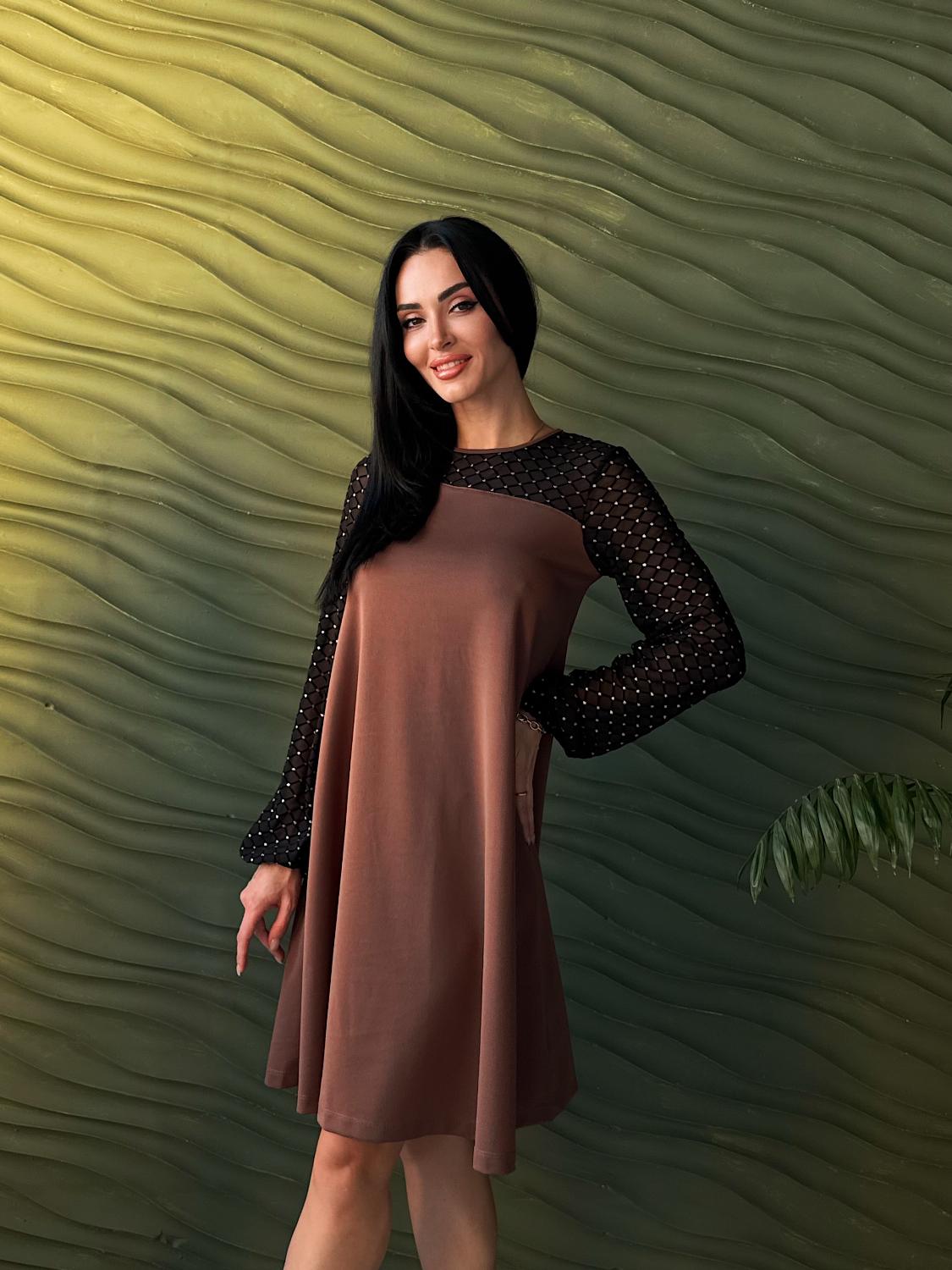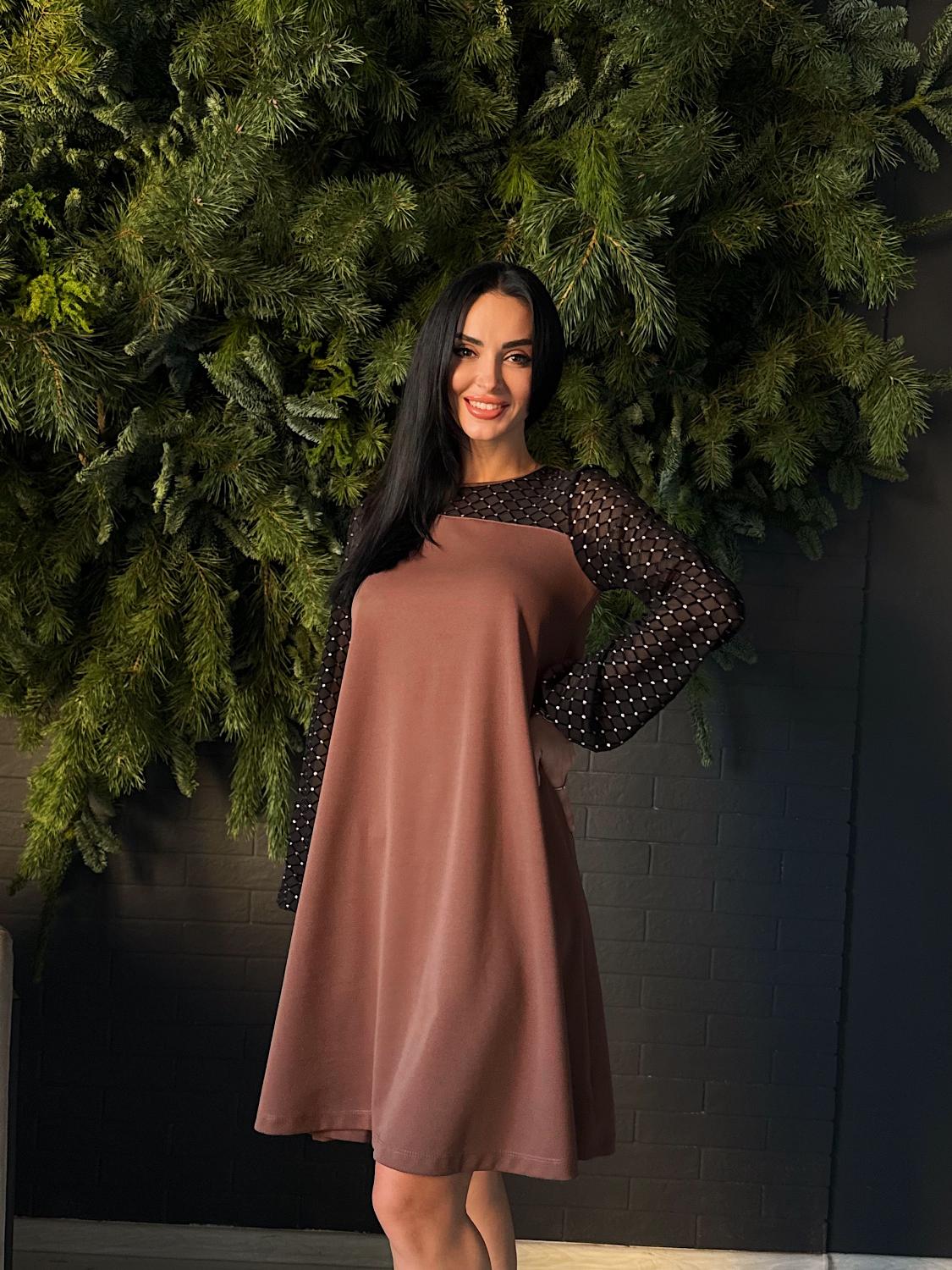 Вечірня сукня з прозорими рукавами — це елегантний вибір для святкових подій, корпоративів, ресторанних виходів чи походів до театру. Поєднання креп дайвінгу та прозорої сіточки з блискітками створює оригінальний контраст, завдяки якому модель виглядає вишукано та одразу привертає увагу. Класичні кольори підкреслюють універсальність і роблять сукню доречною для будь-якого «виходу в світ». Трапецієподібний вільний крій м’яко окреслює фігуру та гарантує комфорт, а довгі рукави з блискучої сіточки додають образу святковості й особливого шарму.