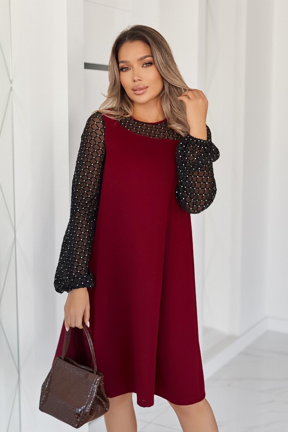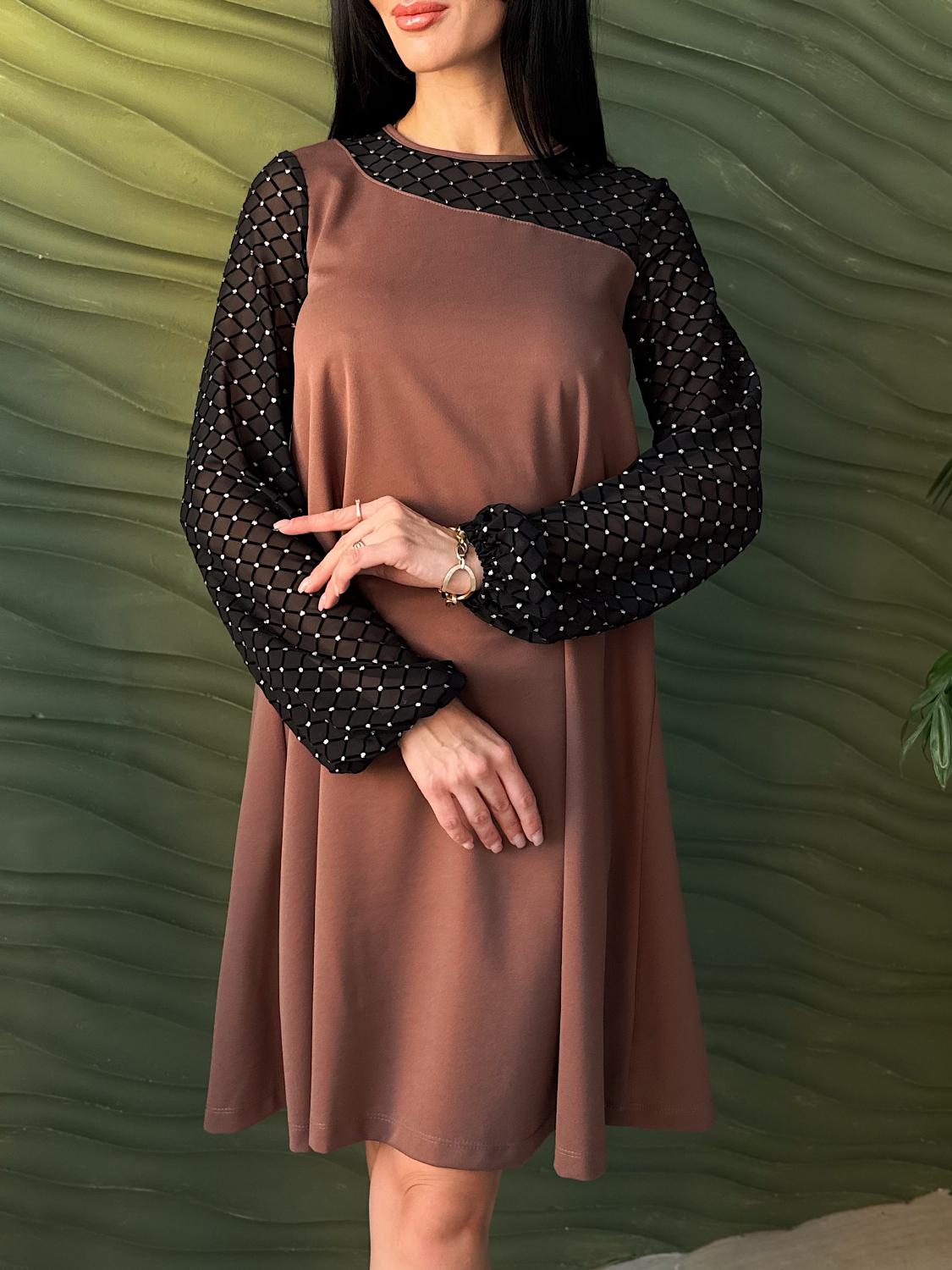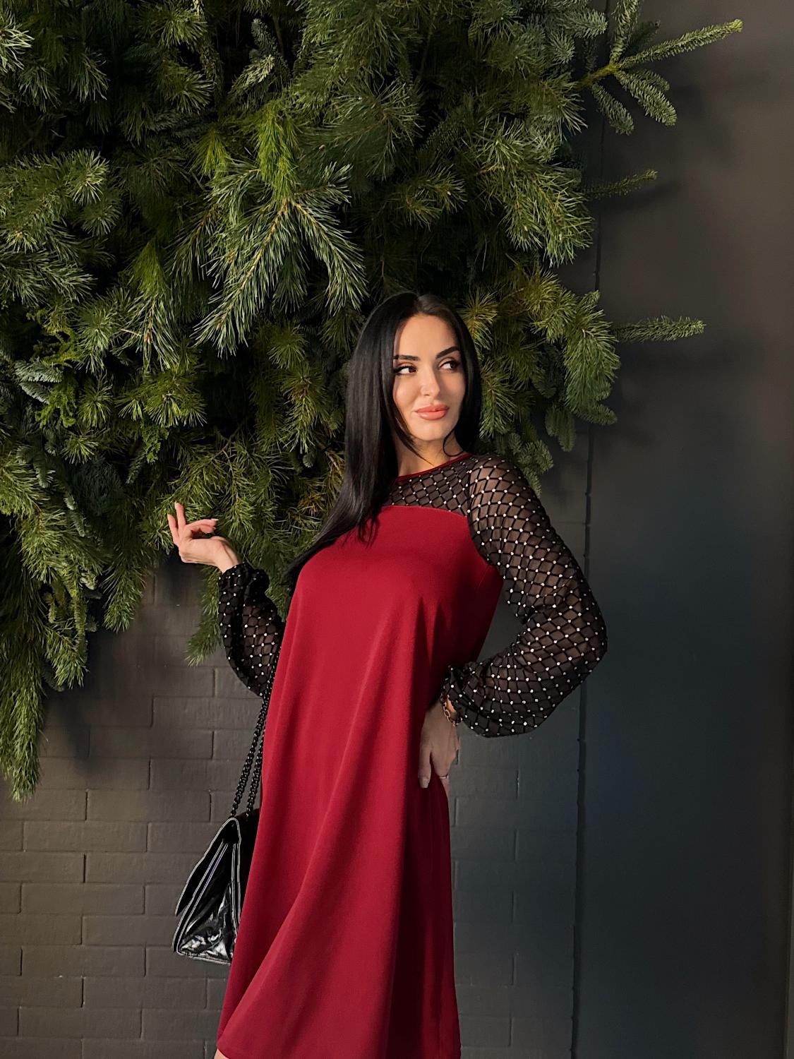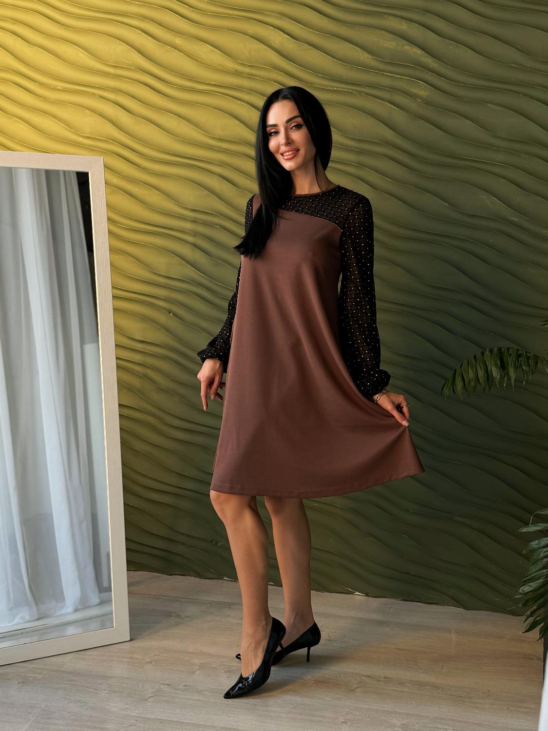 Вечірня сукня з прозорими рукавами — це елегантний вибір для святкових подій, корпоративів, ресторанних виходів чи походів до театру. Поєднання креп дайвінгу та прозорої сіточки з блискітками створює оригінальний контраст, завдяки якому модель виглядає вишукано та одразу привертає увагу. Класичні кольори підкреслюють універсальність і роблять сукню доречною для будь-якого «виходу в світ». Трапецієподібний вільний крій м’яко окреслює фігуру та гарантує комфорт, а довгі рукави з блискучої сіточки додають образу святковості й особливого шарму.